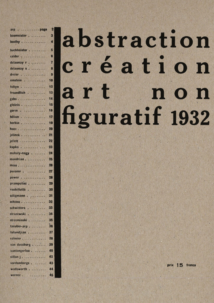 Between 1932 and 1936 five edition of the cahier ‘Abstraction Création: Art non-figuratif’ was published in Paris by the eponymous association, uniting all movements who worked abstractly. The magazine not only formalised a new tendency for language in visual art, but also became a form of explicit self-promotion and opposition against the growing force of figurative Surrealism, led by André Breton. Two minimal yet clear criteria needed to be fulfilled to become a member of the association: you had to be an artist and work non-figuratively. This resulted in a list of members of long-forgotten artists mingled with names such as Kandinsky, Mondrian, Calder, Delaunay, Van Doesburg, and Brancusi. This is the first time all cashiers are translated into English.