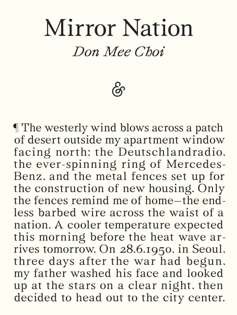 Much like Proust’s madeleine, a spinning Mercedes Benz ring outside Choi’s Berlin window prompts a memory of her father on the Glienicker Bridge between Berlin and Potsdam, which in turn becomes catalyst for delving into the violent colonial and neocolonial contemporary history of South Korea, with particular attention to the horrors of the Gwangju Uprising of May 1980. Here, photographs, news footage, and cultural artifacts commingle with a poetry of grief that is both personal and collective. Inspired by W. G. Sebald and Walter Benjamin as well as Choi’s DAAD Artists residency in Berlin, Mirror Nation is a sorrowful reflection on the ways in which a place can hold a “magnetic field of memory,” proving that history doesn’t merely repeat itself; history is ever present, chiming the hours in a chorus against empire.