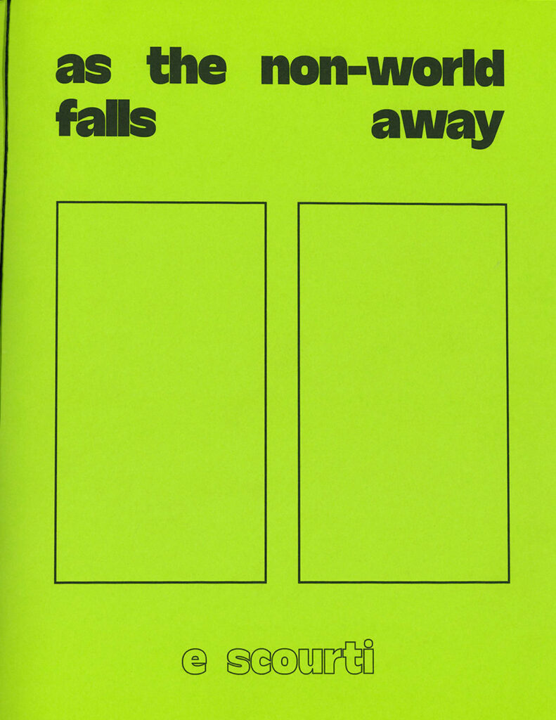 as the non-world falls away is set of fragmented poetic compositions, created through iPhone scans of the artists notebook that have then been worked over digitally, testing the boundaries between image and text in a palimpsestic manner WITHOUT THE E is a series of pamphlets responding to a presence or an absence felt in contemporary digital culture.