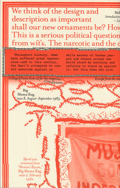 This seventh issue, four folded offset-printed posters, publishes sampled and reworked material from the feminist collective and publication Big Mama Rag (1972–84, Denver, Colorado), specifically focusing on the issues and articles dealing with the Palestinian and international feminist struggle. Typeset alongside this archival collage is “Introduction to The Weather” (2001) by poet Lisa Robertson.