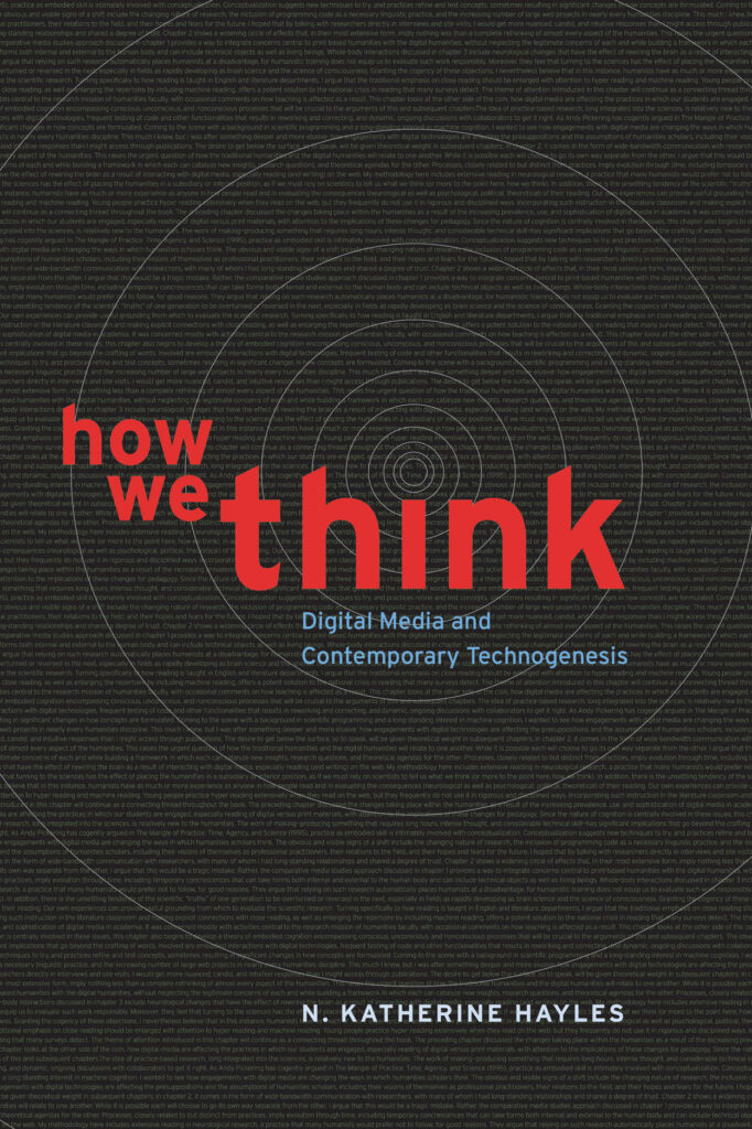 “How do we think?” N. Katherine Hayles poses this question at the beginning of this bracing exploration of the idea that we think through, with, and alongside media. As the age of print passes and new technologies appear every day, this proposition has become far more complicated, particularly for the traditionally print-based disciplines in the humanities and qualitative social sciences. With a rift growing between digital scholarship and its print-based counterpart, Hayles argues for contemporary technogenesis—the belief that humans and technics are coevolving—and advocates for what she calls comparative media studies, a new approach to locating digital work within print traditions and vice versa.