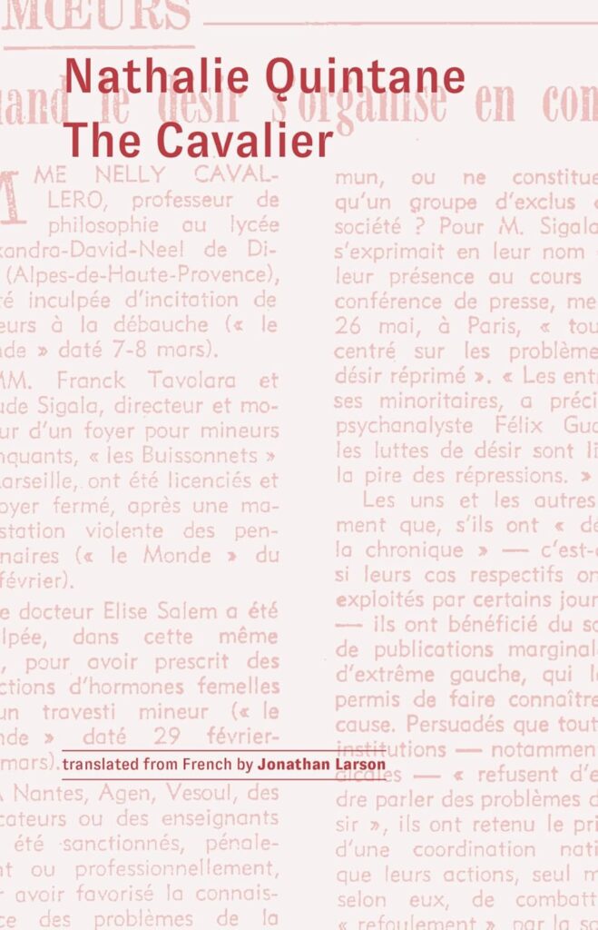 A Parisian ’68er embarks to the provinces to teach high school Philosophy but is soon driven out for “corrupting the youth” Fifty years later, and teaching in the same French Alpine town, Nathalie Quintane delves into the scandal to probe the political order and the failures of a utopian generation After the social upheavals of the late 1960s, the barricaded streets gave way to self-managed communal living in the backcountry While it was the school teacher Nelly Cavallero who attracted the media spotlight, countless other insurgent unruly radicals contested the oppressive order, organizing in schools, factories, and communes In The Cavalier, Quintane paints an intimate and urgently political portrait of revolutionary desires and the rising tides of reaction that determined, among many others, Nelly’s fate.