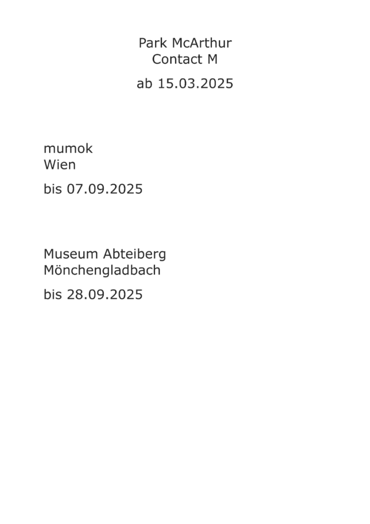 The publication „Park McArthur. Contact M“ is the artist’s book accompanying the exhibition. It contains works and texts by Park McArthur, Geelia Ronkina, numerous color illustrations and a comprehensive list of works and literature. The bilingual English-German publication is published by Verlag der Buchhandlung Walther und Franz König.