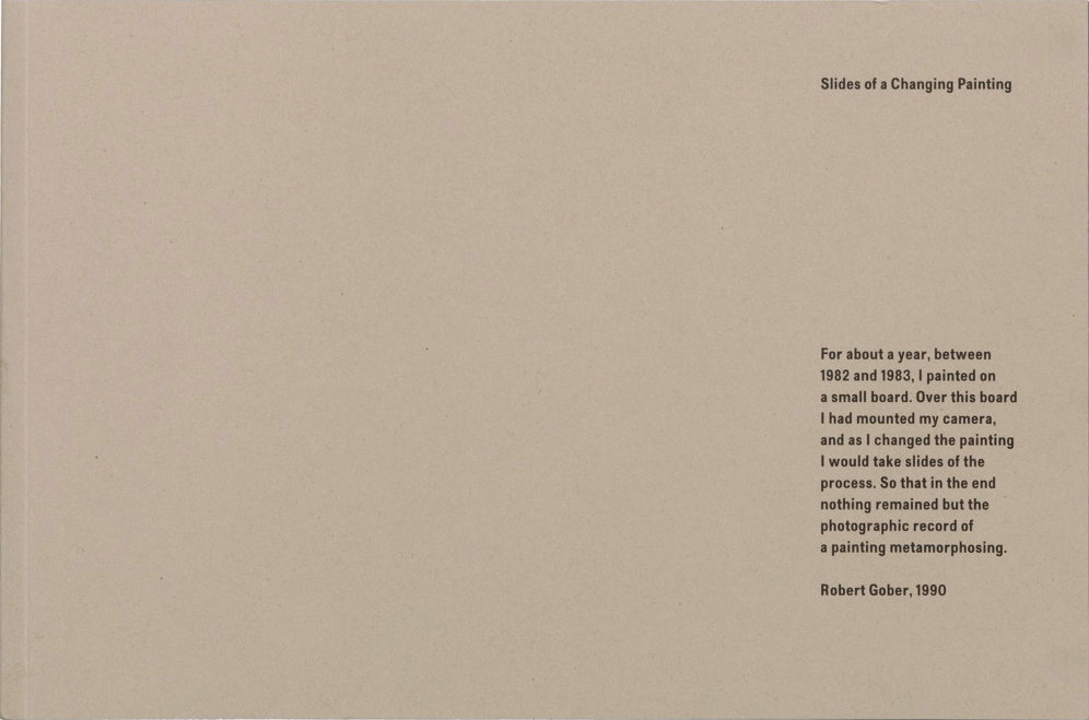 Slides of a Changing Painting is a new artist book by Robert Gober that takes as its point of departure the artist’s highly influential, yet rarely seen, early work of the same name—a slide presentation documenting a year-long evolution of a single painting. Presented at Paula Cooper Gallery in 1984 with three projectors and eighty-nine slides, the work showcased themes and subjects that would become central to Gober’s oeuvre and in hindsight, has come to be seen as a career-spanning lexicon for the artist’s practice. This artist book has been designed to replicate the experience of the original installation, with eighty-nine images dissolving into each other over the course of 368 pages, creating what Gober has referred to as the “memoir of a painting.” This is the first time that Slides of a Changing Painting has been showcased in its entirety in book form.