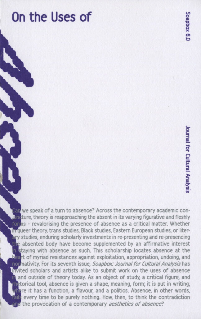 Can we speak of a turn of absence? Across the contemporary academic conjuncture, whether in queer theory, trans studies, Black studies, Eastern European studies, or literary studies, enduring scholarly investments in re-presenting and re-presenting the absented body have become supplemented by an affirmative interest in staying with absence as such, allocating absence at the heart of myriad resistances against explotiation, approporiation, undoing, and normativity. As an object of study, a critical figure, and theoretical tool, absence is given a shape, meaning, form; it is put in writing, where it has a function, a flavour, and a politics. Absence, in other words, falls every time to be purely nothing. How, then, to hink the contraction and the provocation of a contemporary aesthetics of absence?